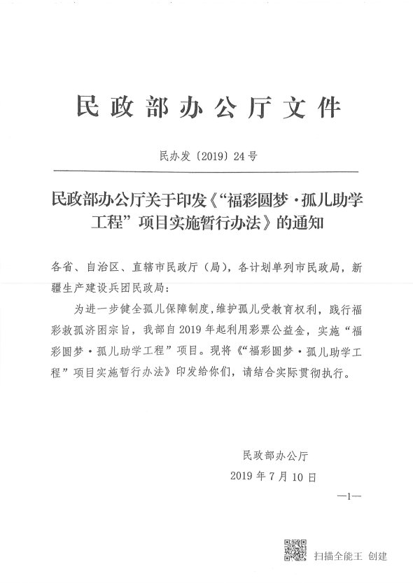 現(xiàn)將民政部辦公廳《關(guān)于印發(fā)〈“福彩圓夢·孤兒助學工程”項目實施暫行辦法〉的通知》(民辦發(fā)〔2019〕24號)轉(zhuǎn)發(fā)給你們,并提出我市的貫徹意見,請一并遵照執(zhí)行。