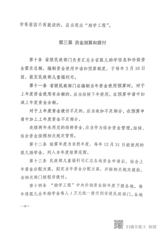 各區(qū)縣(自治縣)民政局應(yīng)于每年年末負責匯總本轄區(qū)孤兒助學信息和補貼資金需求總額,編制資金使用申請和預算額度,于次年2月底前,將孤兒助學名單、資金預算額度和使用申請報送市民政局。
