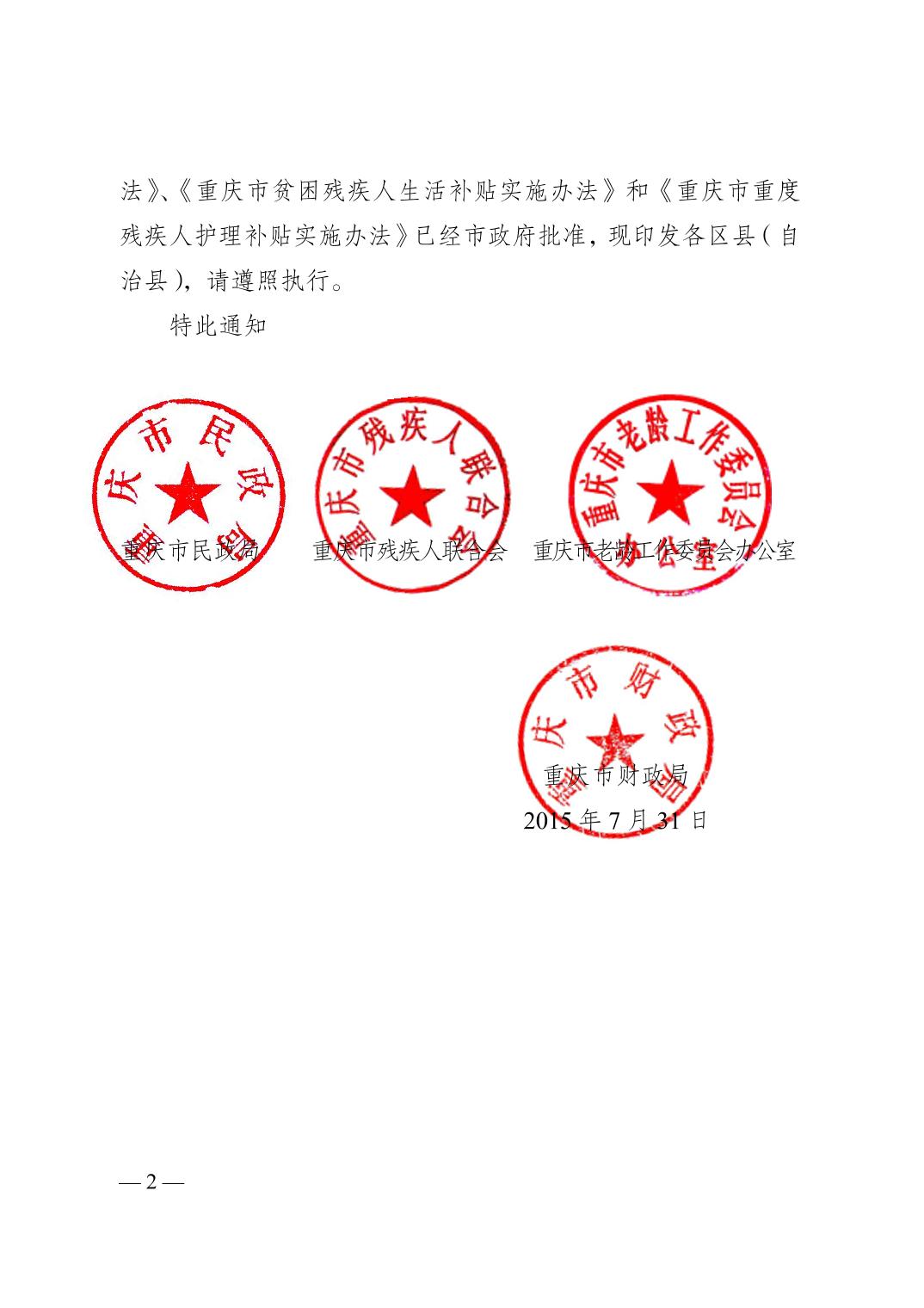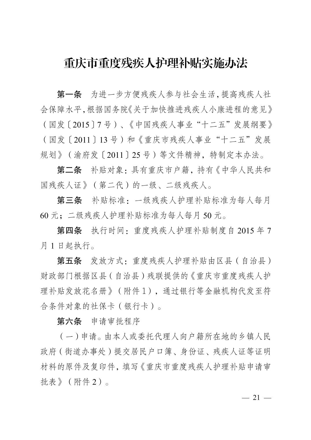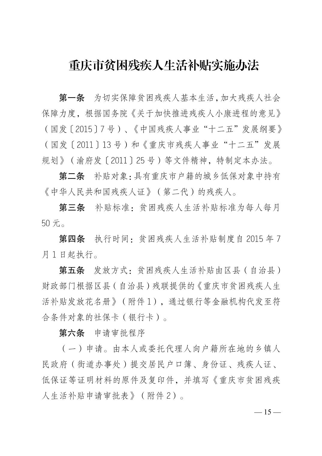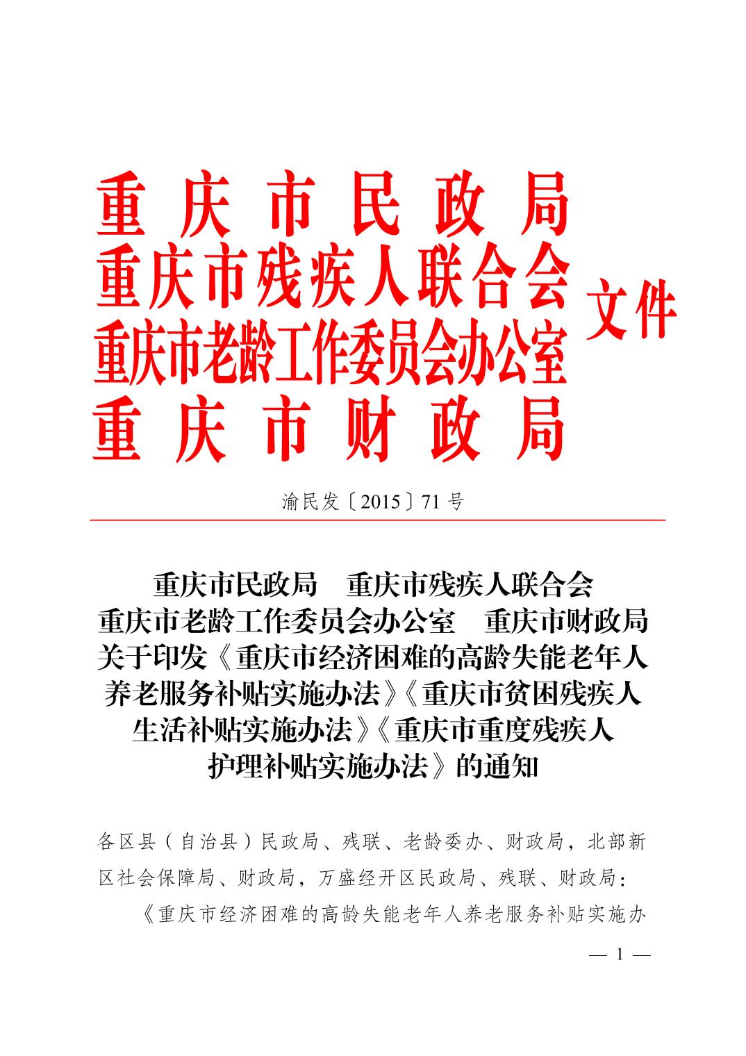 關(guān)于印發(fā)《重慶市經(jīng)濟(jì)困難的高齡失能老年人養(yǎng)老服務(wù)補(bǔ)貼實(shí)施辦法》《重慶市貧困殘疾人生活補(bǔ)貼實(shí)施辦法》《重慶市重度殘疾人護(hù)理補(bǔ)貼實(shí)施辦法》的通知(渝民發(fā)〔2015〕71號(hào))