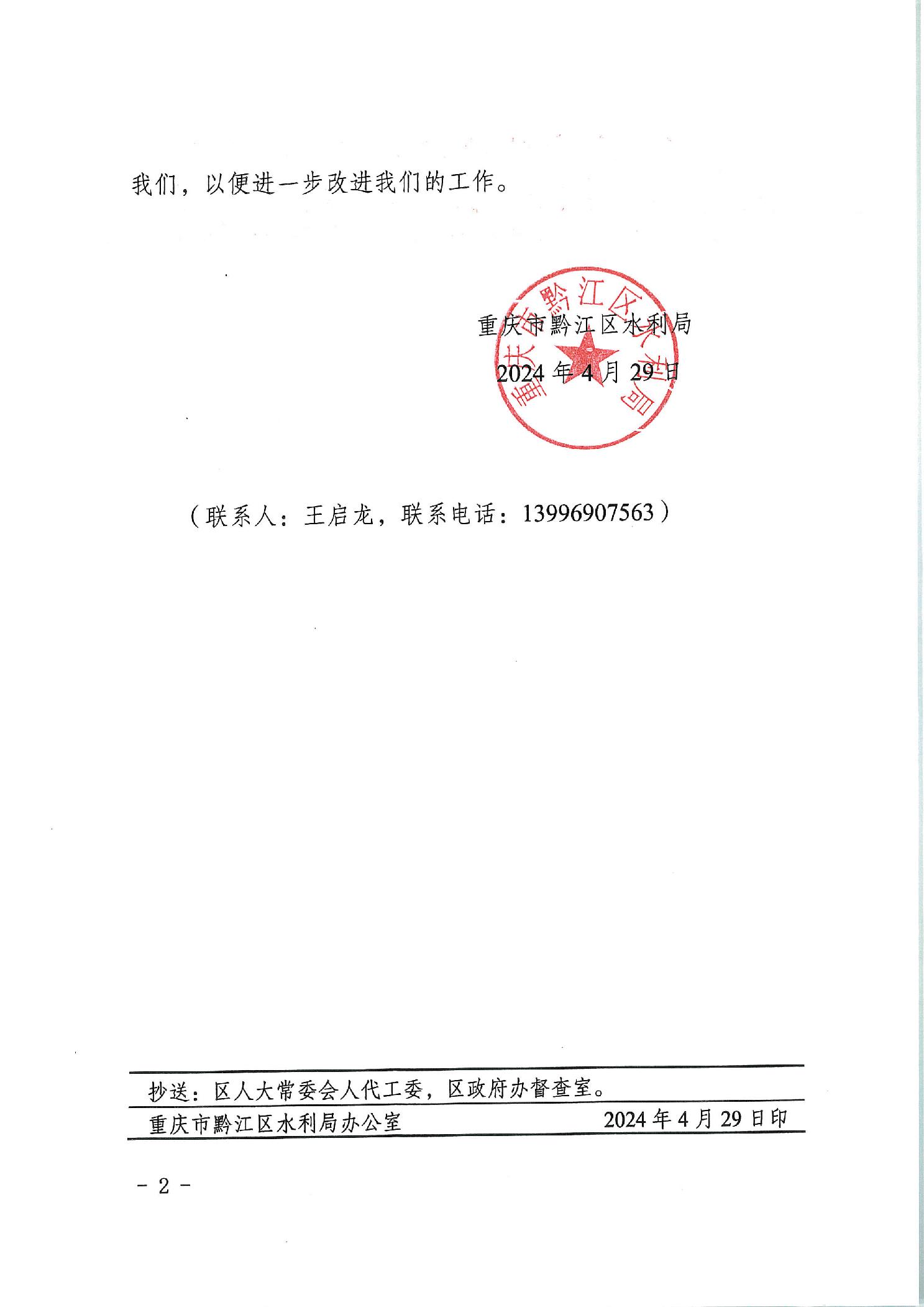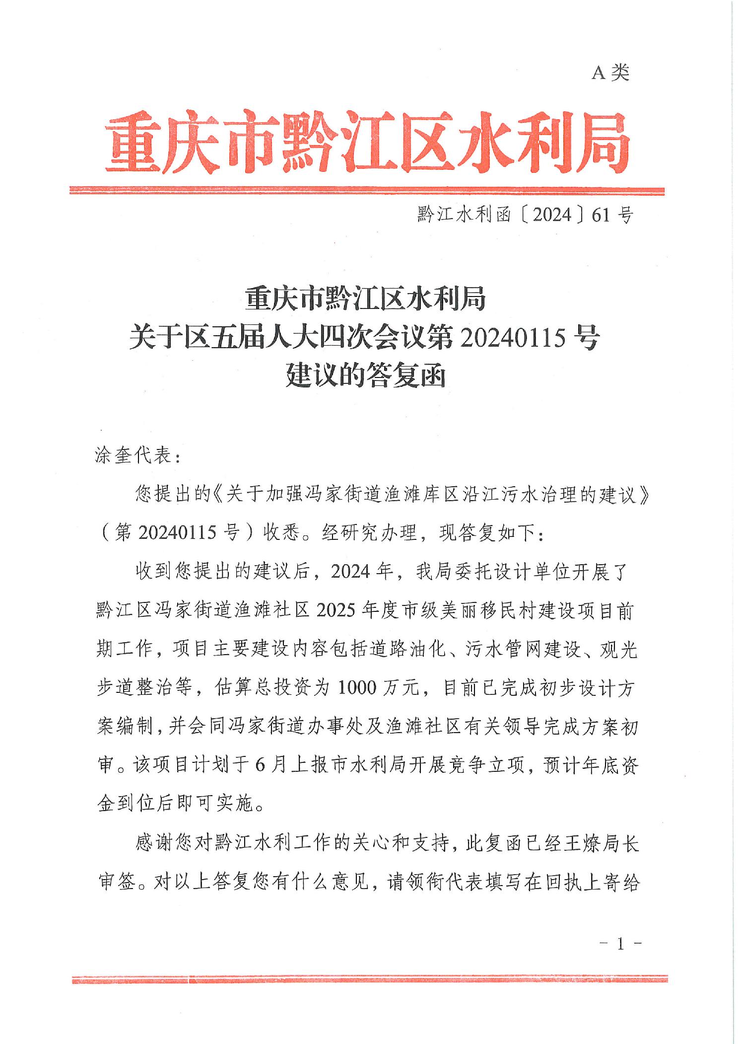 重慶市黔江區水利局關于區五屆人大四次會議第115號建議的答復函