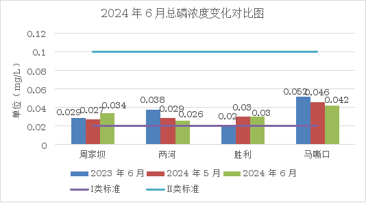 2024年6月,周家壩、勝利、兩河、馬嘶口斷面水質(zhì)均為Ⅱ類,定類因子均為總磷。兩河、馬嘶口斷面總磷濃度同比與環(huán)比總體呈下降趨勢,周家壩斷面則同比與環(huán)比均呈上升趨勢,勝利斷面環(huán)比持平,同比上升。其中:周家壩斷面總磷濃度同比升高14.7%,環(huán)比升高20.6%;兩河斷面總磷濃度同比下降46.1%,環(huán)比下降11.5%;勝利斷面總磷濃度同比升高33.3%,環(huán)比持平;馬嘶口斷面總磷濃度同比下降23.8%,環(huán)比下降9.5%。2024年6月周家壩等四個斷面總磷濃度同比環(huán)比變化對比情況詳見圖1。