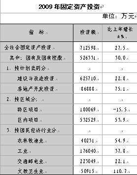全區(qū)全社會(huì)固定資產(chǎn)投資完成71.26億元,比上年增長(zhǎng)27.5%,其中建設(shè)與改造投資完成62.57億元,增長(zhǎng)22.8%,基礎(chǔ)設(shè)施建設(shè)投資 29.57億元,占全社會(huì)固定資產(chǎn)投資的 41.5%;房地產(chǎn)開發(fā)投資完成8.69億元,增長(zhǎng)75.1%。國(guó)民經(jīng)濟(jì)各行業(yè)中,農(nóng)林牧漁業(yè)投資4.02億元,增長(zhǎng)54.9%;工業(yè)投資17.6億元,增長(zhǎng)37.8%;交通郵電業(yè)投資22.30億元,增長(zhǎng)22.1%。