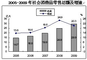 2009年限額以上貿(mào)易企業(yè)實(shí)現(xiàn)零售額9.69億元,增長(zhǎng)34.0%,增幅比社會(huì)消費(fèi)品零售總額增幅高出10.1個(gè)百分點(diǎn)。限額以上批發(fā)和零售業(yè)大類商品零售中,汽車類、建筑及裝潢材料類、家具類、家用電器和音像器材類、服裝鞋帽、針紡織品類、化妝品類均增長(zhǎng)30%以上;限額以上企業(yè)對(duì)社會(huì)消費(fèi)品零售總額的貢獻(xiàn)率達(dá)到39.8%。限額以上貿(mào)易企業(yè)汽車零售額 1.26億元,比上年增長(zhǎng)68.3%,汽車零售額占全社會(huì)消費(fèi)品零售總額的4.2%,其比重比上年提高2.8個(gè)百分點(diǎn)。