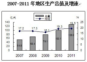 初步核算,2011年全區(qū)實(shí)現(xiàn)地區(qū)生產(chǎn)總值129.19億元,比上年增長19.5%,其中第一產(chǎn)業(yè)實(shí)現(xiàn)增加值13.78億元,增長5.5%;第二產(chǎn)業(yè)增加值71.55億元,增長24.6%;第三產(chǎn)業(yè)增加值43.87億元,增長16.3%。三次產(chǎn)業(yè)比例由上年的10.6∶53.5∶35.9調(diào)整為10.6∶55.4∶34,三次產(chǎn)業(yè)對(duì)經(jīng)濟(jì)增長的貢獻(xiàn)率分別為3.1%、66.5%和30.4%。