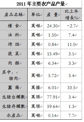 2011年實(shí)現(xiàn)農(nóng)林牧漁業(yè)總產(chǎn)值21.6億元,比上年增長4.4%,其中種植業(yè)9.05億元,增長2.8%;林業(yè)1.23億元,增長4.6%;牧業(yè)10.98億元,增長5.9%;漁業(yè)0.18億元,增長4.9%。