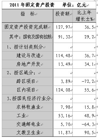 2011年,全區(qū)固定資產(chǎn)投資完成127.97億元,比上年增長36.5%,投資對(duì)經(jīng)濟(jì)增長的貢獻(xiàn)率為59%,拉動(dòng)經(jīng)濟(jì)增長11.5個(gè)百分點(diǎn),其中國有投資實(shí)現(xiàn)91.32億元,占投資總量的71.4%,成為投資增長的主導(dǎo)力量。全年建設(shè)與改造投資完成114.48億元,增長36.7%,占投資總量的89.5%;房地產(chǎn)開發(fā)投資完成13.49億元,增長34.1%。國民經(jīng)濟(jì)各行業(yè)中,農(nóng)林牧漁業(yè)完成投資7.98億元,增長15.8%;工業(yè)完成投資53.16億元,增長48.9%;教育衛(wèi)生文化事業(yè)完成投資11.86億元,增長90.5%。