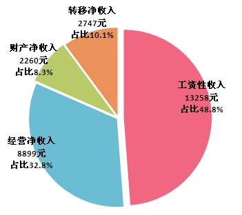 全年城鎮常住居民人均可支配收入27164元,比上年增加2492元,增長10.1%。其中,工資性收入13258元,增長9.1%;經營凈收入8899元,增長12.5%;財產凈收入2260元,增長13.1%;轉移凈收入2747元,增長5.2%。全年常住居民人均消費支出19155元,增加953元,比上年增長5.2%。