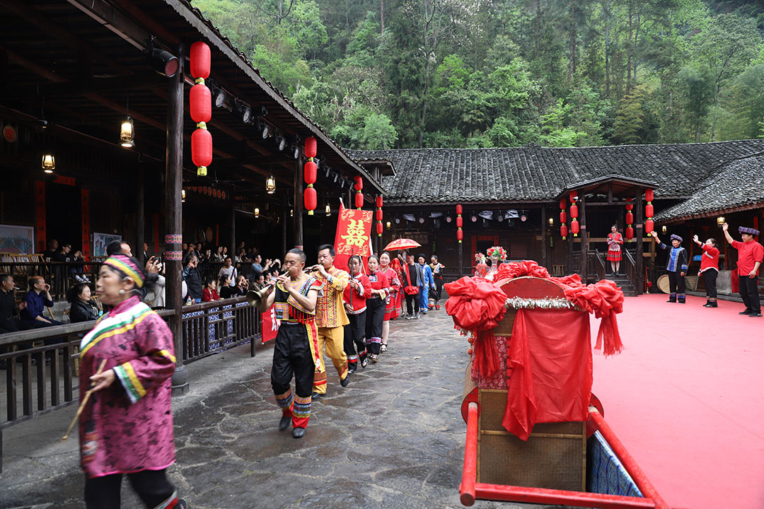 土家族歷史上的婚姻比較自由,男女雙方經過自由戀愛,征得雙方父母同意,經土老師(巫師)作證,即可結為夫妻。黔江曾有骨種婚、扁擔親、開調親、坐床和填房等極具地方特色的婚俗,這些舊習在清光緒年間被官府要求廢除,開始推行漢族婚俗禮儀,推行“納采、問名、納吉、納征、請期、親迎”六禮,講究“父母之命,媒妁之言”。“改土歸流”以后,土家族婚俗雖然已逐漸接近當地漢民習俗,但也保留了一些本民族特點,被列入市級非物質文化遺產名錄。如今,傳習至今的土家族傳統婚俗主要有提親、認親、討庚、哭嫁、迎親、拜堂、坐床、回門等,其中以哭嫁習俗最具特色,哭嫁歌亦歌亦哭,句式自由,感染力強。