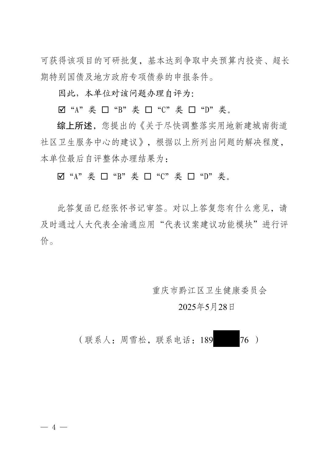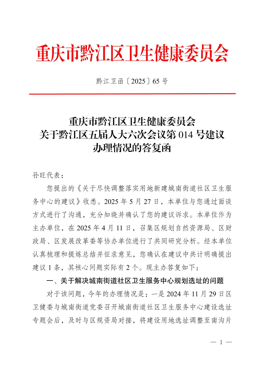 重慶市黔江區衛生健康委員會關于黔江區五屆人大六次會議第014號建議辦理情況的答復函