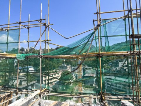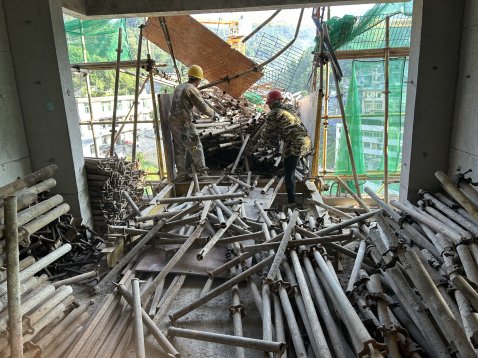 圖一:12層被吊運的鋼管掉落砸彎的外架鋼管架