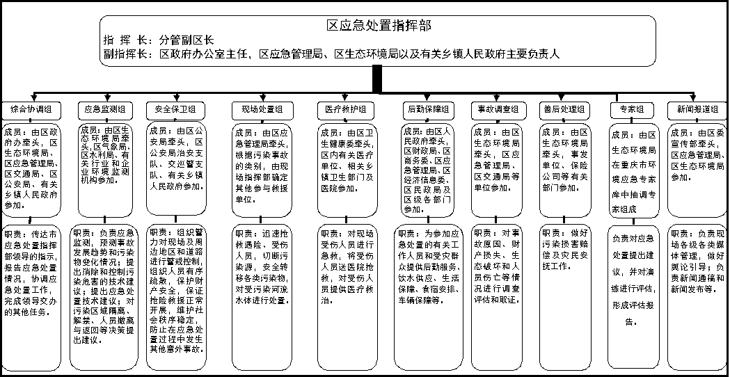 在區政府統一領導下,根據應急處置工作需要,成立黔江區突發環境事件應急處置指揮部(以下簡稱區指揮部),由區政府分管副區長任指揮長,區政府辦有關副主任,區生態環境局、區應急管理局、區交通局等有關部門以及有關鄉鎮街道主要負責人任副指揮長,實行指揮長負責制,統一領導、組織、指揮應對工作。區指揮部下設綜合協調、搶險救援(下設專家組)、應急監測、醫學救援、應急保障、輿論引導、社會穩定、善后工作、事件調查等工作組(根據應對工作需要可調整工作組設置,各工作組職責見附件1)。